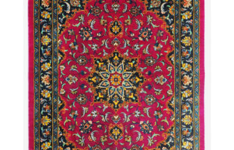 クム産のシルク絨毯です。オーソドックスなブルーのメダリオンデザインが落ち着いた雰囲気の作品です。さらにボーダーの赤が…