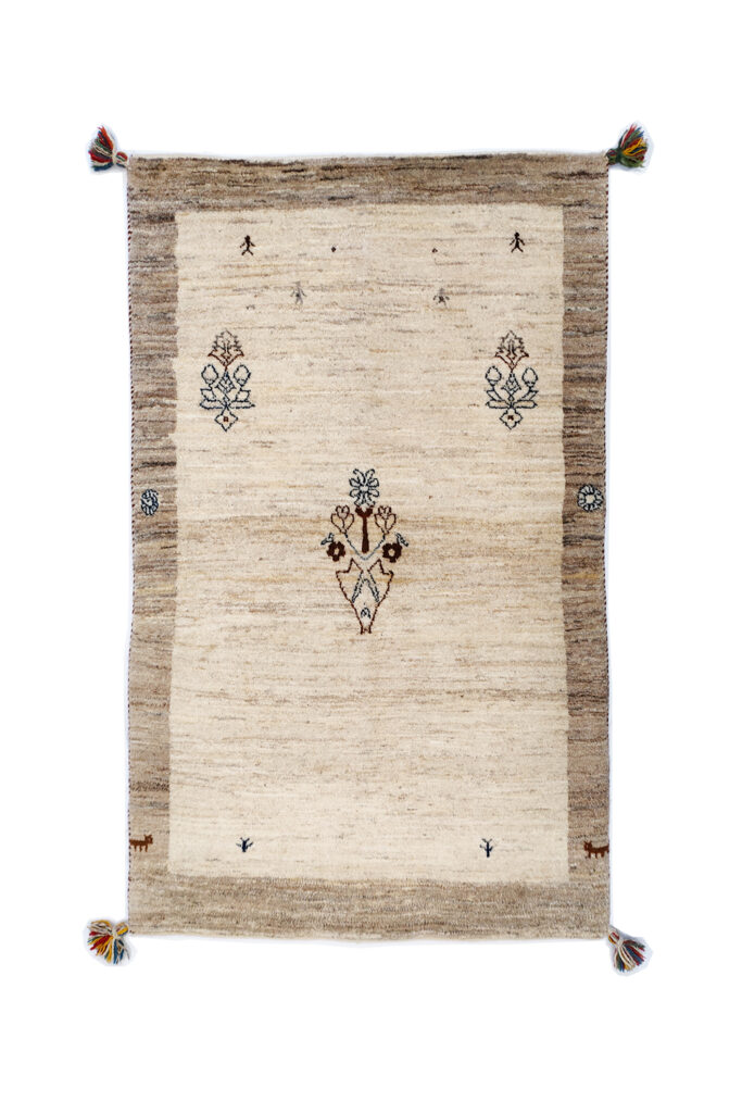 無染織の羊の毛をメインにした明るい色調の絨毯です。中央の花瓶紋様が特徴的で非常にシンプルなデザインです。白色のグラデーションは優しくどのお部屋にもマッチすると思います。ハイクラスのギャッベなので織りの細かさと素材のウールも最高クラスです。使用していただくと上質感を実感できます。