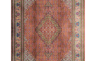 クム産のシルク絨毯です清潔感のある白地に可愛らしいオレンジが目を引きます。バランスの取れたデザインで敷く場所を選びません。玄関など明るい空間作りに最適です。