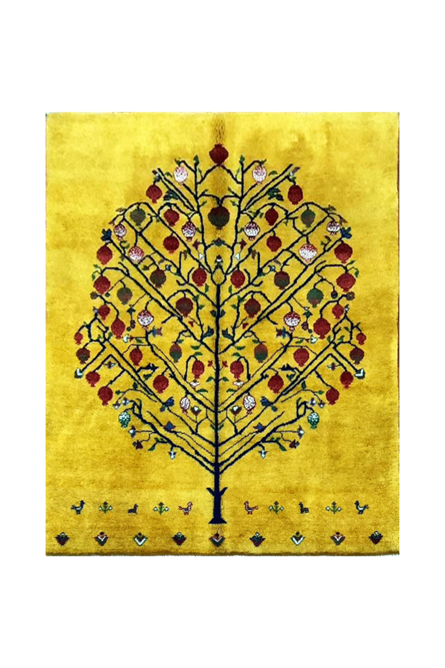 ザクロの皮で染めた鮮やかな黄色をベースに、一本のザクロの樹を描いた印象的なデザインです。周りには小さな動物が可愛らしく配置されています。高品質なウールを使用し、手織りで作られたこのラグは、耐久性と快適性に優れ、リビングや寝室などで使用できます。